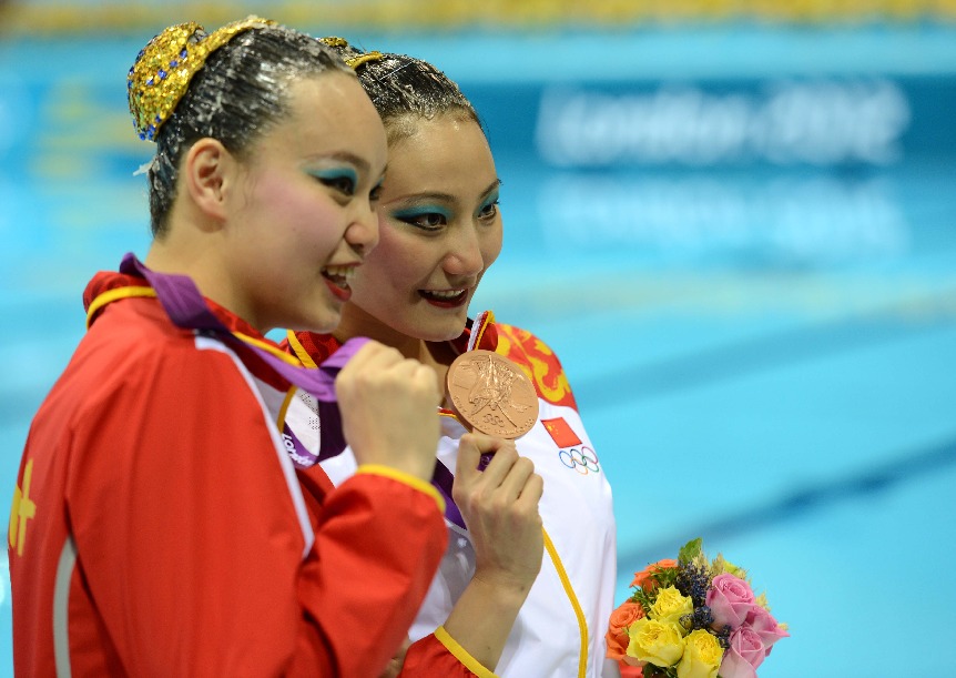 2012年8月7日花樣游泳雙人自由自選頒獎儀式舉行,中國組合黃雪辰劉鷗(右)獲得銅牌