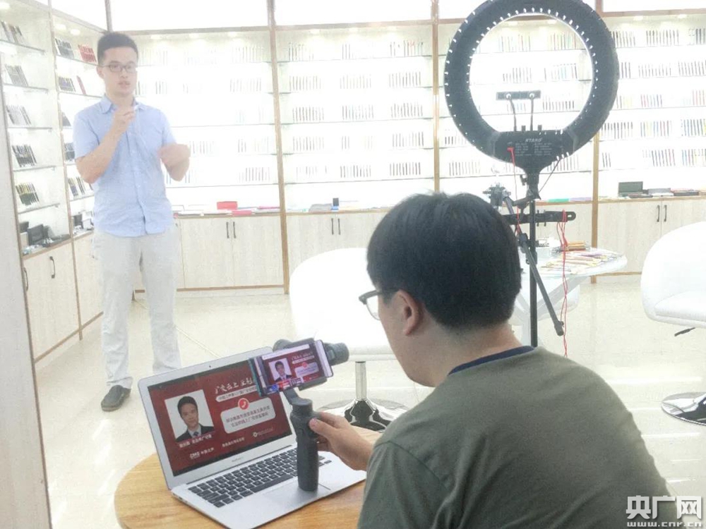 總臺央廣記者謝元森在凱龍文具禮品有限公司的廣交會直播間直播采訪