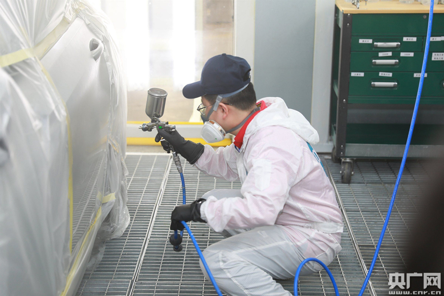 當(dāng)?shù)弥袡C(jī)會到工廠現(xiàn)場噴漆后,他特意帶上了參賽時的工裝和工具。盡管在一線實操,與之前在教學(xué)場景有很大差異,但從調(diào)色到噴涂,王濤扎實的基本功還是贏得了老師傅們的一致肯定。
