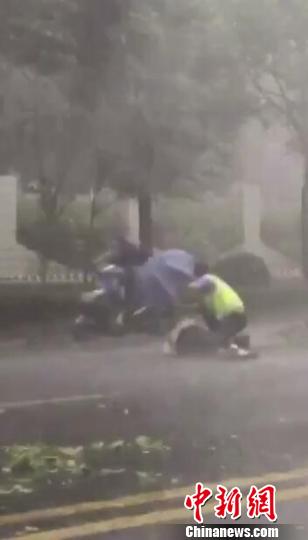 狂風暴雨中,民警為倒地男子擋住了風雨和過往車輛!∧繐粽咭曨l截圖 攝