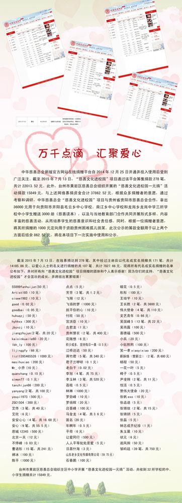 中華慈善總會新版官方網站在線捐贈平臺自2014年12月25日開通并投入使用后受到廣泛關注。截至2015年7月13日,“慈善文化進校園”項目通過該平臺籌集捐款278筆,共計22013.52元。此外,臺州市黃巖區慈善總會組織開展的“慈善文化進校園一元捐”活動捐款15849元,與上述網絡募捐資金合計37862.52元。根據眾多捐贈者的意愿,通過考察和調研,中華慈善總會“慈善文化進校園”項目與貴州省貴陽市慈善總會合作,拿出36000元用于向貴陽市開陽縣毛云鄉中心學校、南江鄉中心學校和龍崗鄉龍崗中學三所學校中小學生贈送3000冊《慈善讀本》,以及與當地教育部門合作共同開展形式多樣、內容豐富的慈善活動,從而培養學生的慈善意識和社會責任感。同時,根據一位捐贈者意愿,將其所捐贈的1000元定向用于資助貴州困難孤兒田某。此次公示的籌款金額用于以上兩個方面后結余862.52元,將在本項目下一次實施中使用和公示。