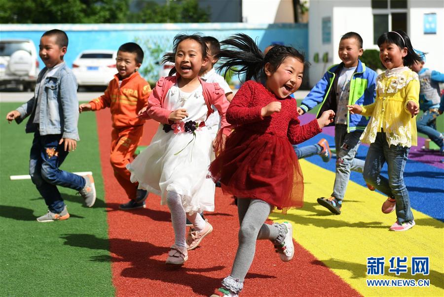 5月23日,甘肅省隴南市康縣長壩鎮(zhèn)幼兒園的孩子在操場上奔跑玩耍。