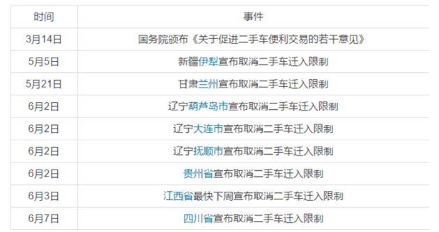 因此,今年3月,國務院發布《關于促進二手車便利交易的若干意見》,明確要求除有特殊要求的城市外,其他省市要在5月底徹底完成解除限遷的落地實施。