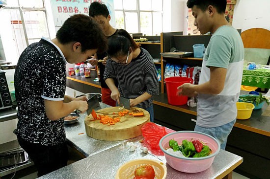 楊海北是河北唐山人,來到湖北上大學后,經常聽到周圍的同學懷念家鄉菜的聲音,但是學校食堂吃不到自己想吃的菜,又不能在寢室里開火做飯。“為什么不建立一個平臺,讓大家既可以動手做自己想吃的菜,同時還可以提供空間讓大家一起享用呢?”楊海北迅速把自己的想法和校飲食中心的郭經理反映,兩人一拍即合。經過半年的準備工作,今年5月20日,共享廚房正式“誕生”。