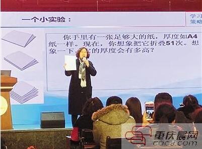 你手里有一張足夠大的紙,厚度如A4紙一樣,你能想象把它折疊51次,厚度會有多高嗎?昨日,中國心理學會會員、中科院心理所《學習策略研究》課題組成員朱淑玲來到渝中區中華路小學,與大家分享如何做一名智慧的學習型家長。