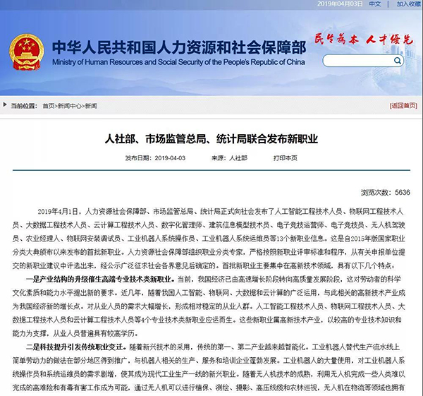 據人力資源社會保障部有關負責人介紹,這13個新職業包括人工智能工程技術人員、物聯網工程技術人員、大數據工程技術人員、云計算工程技術人員、數字化管理師、建筑信息模型技術員、電子競技運營師、電子競技員、無人機駕駛員、農業經理人、物聯網安裝調試員、工業機器人系統操作員、工業機器人系統運維員等。此次發布的13個新職業主要集中在高新技術領域,是自2015年版國家職業分類大典頒布以來發布的首批新職業。