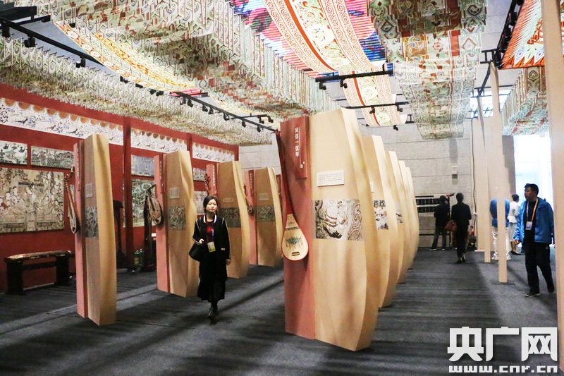 9月27日,在敦煌國際會展中心,參觀者欣賞展出的壁畫仿制樂器。 (央廣網(wǎng)記者 張喬 攝)