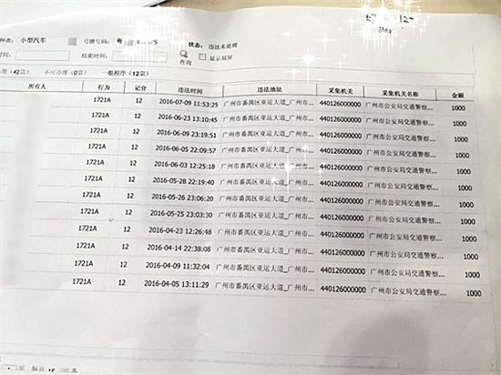 交警大隊相關(guān)負責(zé)人拿出張先生的違章記錄說:“不單是亞運大道,在廣州市區(qū),如內(nèi)環(huán)路A線工業(yè)大道出口,體育東橫街路段等地都有交通違法行為,從2014年10月1日到2016年7月15日,車主共有57宗交通違法記錄,應(yīng)該說法律意識還是比較淡薄!”