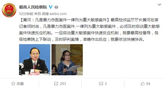 最高檢偵監廳廳長黃河今日在答記者問時說,凡是暴力傷醫案件,一律列為重大敏感案件,必須及時啟動重大敏感案件快速反應機制。一旦啟動重大敏感案件快速反應機制,就要最高檢督導,各級檢察院上下聯動,及時研判案情,準確作出反應;就要依法快捕快訴。