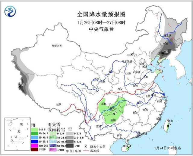 24日08時至25日08時,新疆北部與西南部的部分地區有小到中雪,局地大雪;陜西南部、四川盆地西南部和東北部、重慶中東部、湖北西部、貴州中西部、海南島、臺灣等地的部分地區有小雨或陣雨,局地中雨。臺灣海峽、南海東北部和中東部偏北海域有7~8級、陣風9~10級的東北風。