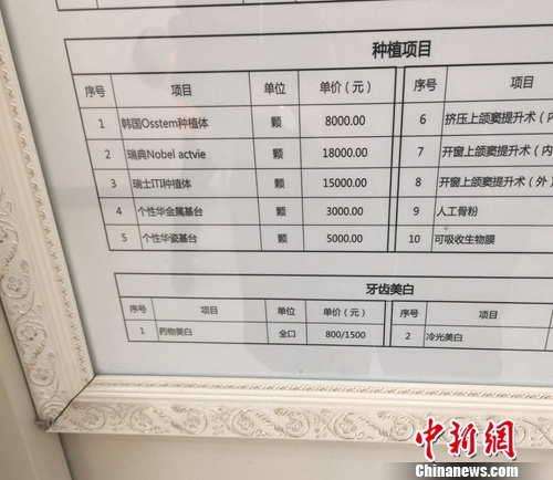 圖為北京一私立醫(yī)院的種牙項目價格。呂春榮 攝