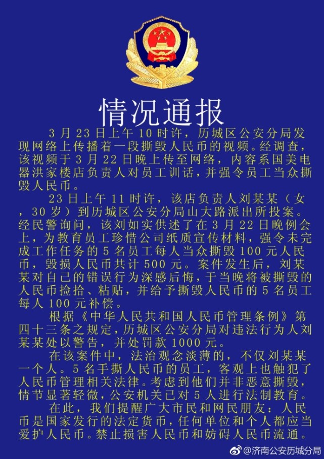 中新網3月23日電 據濟南市公安局歷城區分局官方微博消息,今日,歷城區公安分局就網上傳播的一段撕毀人民幣的視頻進行調查。調查結果顯示,視頻內容系國美電器洪家樓店負責人對員工進行訓話,并強令員工當眾撕毀人民幣。歷城區公安分局對違法行為人劉某某處以警告,并處罰款1000元。