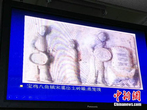 王仁湘在講座中展示考古照片,圖中文物為陜西寶雞八魚鎮宋墓出土的蒸籠圖磚雕。中新網記者 宋宇晟 攝