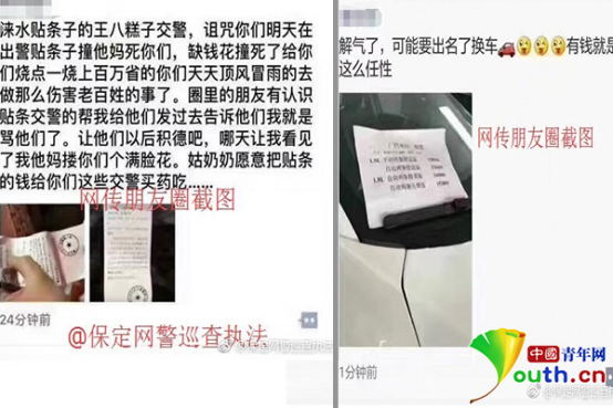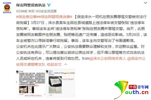 中國青年網北京3月29日電(記者 李永鵬 見習記者 劉利影)近日,河北省保定市淶水縣某車主因3月26日在縣城道路上違法停車,被值勤民警張貼“違法停車告知單”。事后,該車主將“違法停車告知單”配以辱罵性的文字在“朋友圈”發布并號召他人轉發。3月28日,該車主因尋釁滋事被警方行政拘留。事后,該車主寫出了書面道歉信。