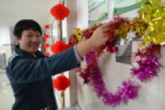 呂迎春參加監(jiān)獄文藝匯演演出布置。山東省女子監(jiān)獄供圖