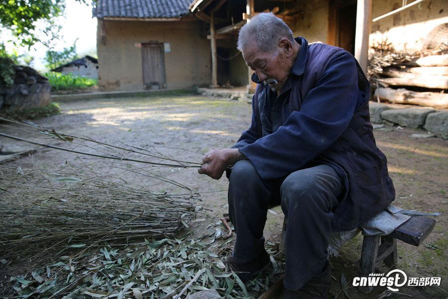 5月23日,陜西省漢中市寧強縣鐵鎖關鎮周家坎村半山腰上,106歲的老壽星王春云在土坯房前將一根根竹枝上的葉子摘掉擺放整齊準備綁掃把。(記者 魏永賢)圖片來源:西部網