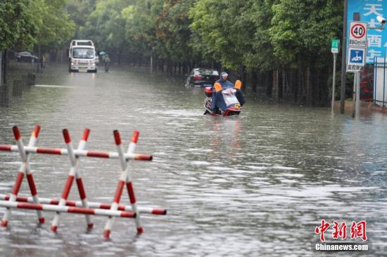 資料圖:6月12日,貴陽市民騎電動車在積水路段行駛。中新社記者 賀俊怡 攝