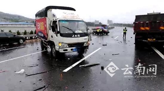 云南網訊(記者 熊強)近日,云南部分州市迎持續降雨天氣,雨天行車需注意安全。7月2日上午10點左右,昆曲高速軍馬場路段發生6車相撞事故,造成3人輕傷。隨后,昆曲大隊對該路段采取臨時交通管制,中午12點左右,事故處理完畢,交通得以恢復。