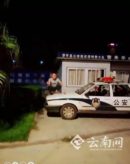 男子踩踏警車,拍照炫耀。云南網 圖