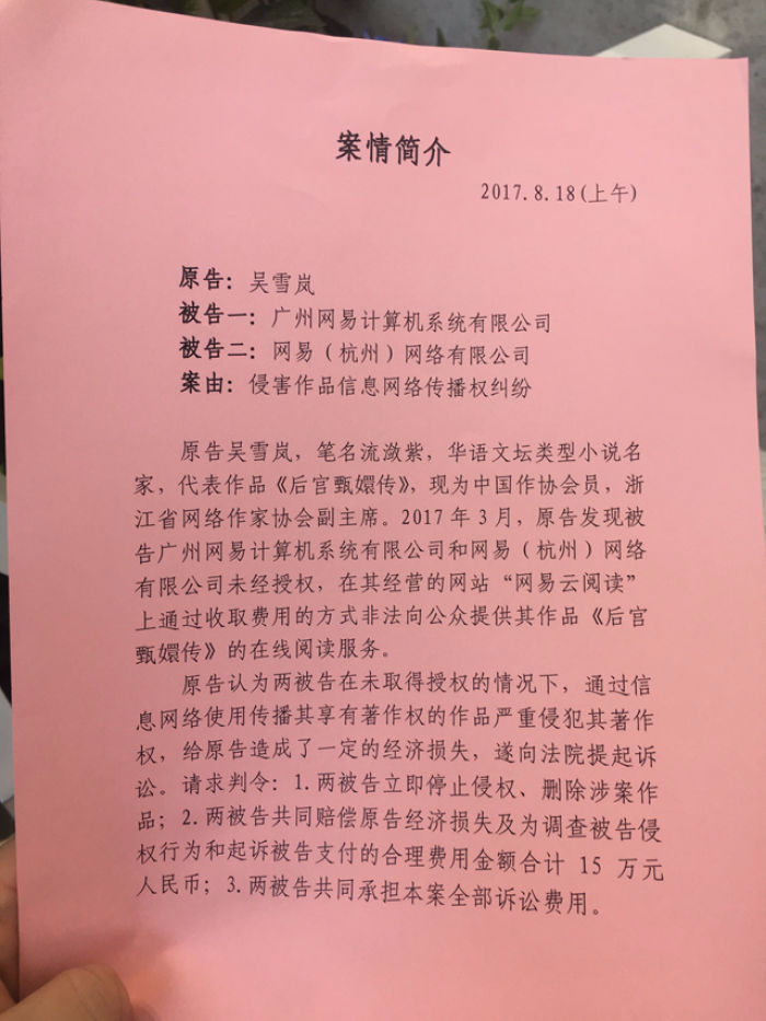 原告為《后宮甄嬛傳》作者,被告為網易公司,起訴案由是,網易未經授權,在其經營的網站“網易云閱讀”上通過收費方式非法向公眾提供《后宮甄嬛傳》的在線閱讀服務。涉及侵害作品信息網絡傳播權糾紛。