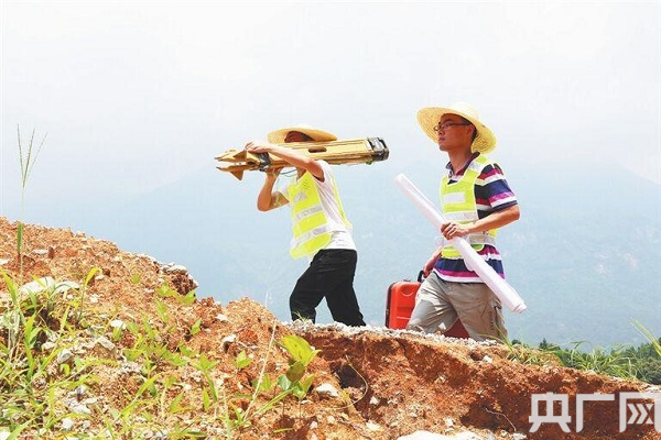 工作人員野外實地踏勘測量(央廣網發 通訊員張華平 查燕萍攝)
