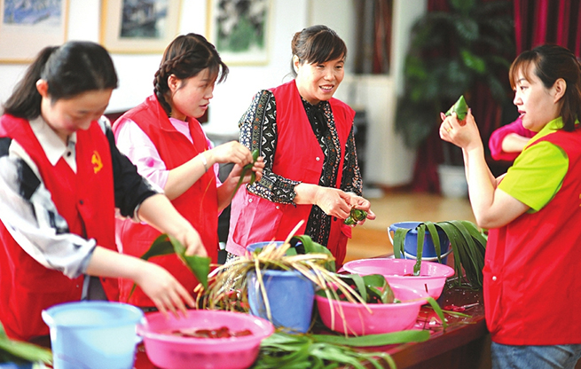 6月3日,志愿者和居民們正在開心地一邊包粽子一邊嘮家常。當日,太原市迎澤街道青年路一社區志愿者提早備好原料,邀請社區困難家庭居民,歡聚一堂包粽子,共話美好生活。(記者李兆民攝)