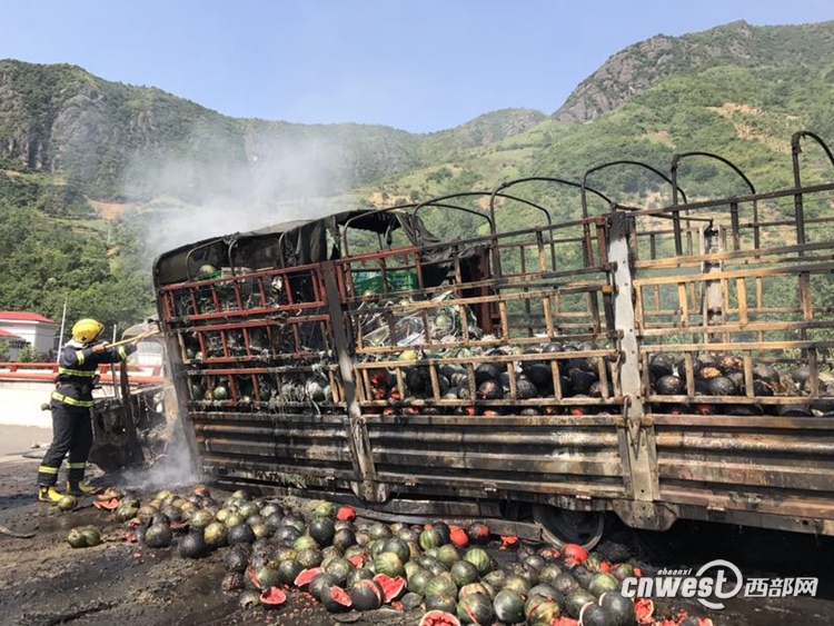 西部網(wǎng)訊(陜西廣播電視臺新聞中心記者李巖 宋潔 通訊員 屈亮)今天(6月27日)早上,福銀高速山陽段一輛拉滿西瓜的貨車發(fā)生大火,燒毀了車上拉的7噸多西瓜,所幸沒有人員傷亡。