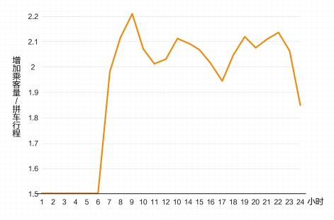拼車增加了車輛在單位行程內(nèi)的載客量,在提高運(yùn)營效率的同時(shí)也提高了交通效率。而交通效率越高,滿足同等出行需求所需的車公里數(shù)也會(huì)相應(yīng)減少。