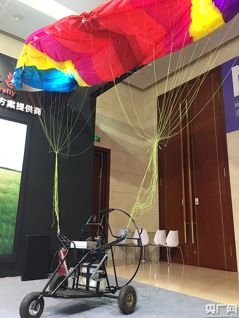 無人動力傘,用于電力巡檢的無人動力傘飛行里程長,速度慢,更方便進行定點拍攝。一飛智控科技的參展商小杜介紹,動力傘的原理是用無線電來操縱傘繩讓它按著既定的路線飛行,通過傘繩的牽引控制它的上升下降、轉彎、速度。飛起來以后通過動壓向傘里充氣,傘就形成了可以提供升力的載體,于是可以把下面的小車給吊起來。動力傘上裝有攝像頭,目前好多要交付的動力傘是用于農業。