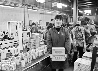 圖為宿州科技食品有限公司員工把水果罐頭包裝成箱。